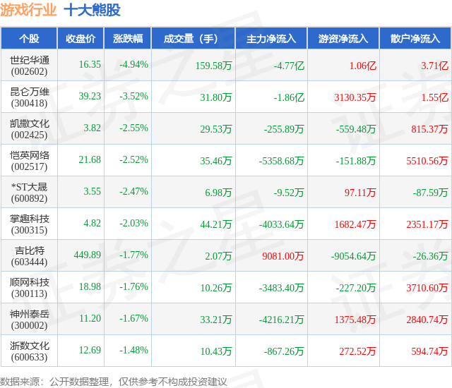 个股表现方面,游戏行业当日领跌股为世纪华通(002602),该股当日报收16.35,下跌4.94%,成交量159.58万,主力资金净流出4.77亿元。昆仑万维(300418)以下跌3.52%紧随其后,该股当日成交量31.8万,主力资金净流出1.86亿元。除此之外,凯撒文化(002425)、恺英网络(002517)、*ST大晟(600892)均进入当日熊股之列。具体个股列表见下表: