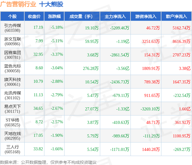 个股表现方面,广告营销行业当日领跌股为引力传媒(603598),该股当日报收17.19,下跌5.18%,成交量19.1万,主力资金净流出5209.46万元。浙文互联(600986)以下跌5.11%紧随其后,该股当日成交量59.95万,主力资金净流出1.19亿元。除此之外,因赛集团(300781)、蓝色光标(300058)、旗天科技(300061)均进入当日熊股之列。具体个股列表见下表: