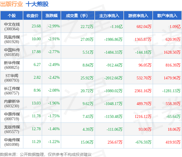 个股表现方面,出版行业当日领跌股为中文在线(300364),该股当日报收23.68,下跌2.99%,成交量22.72万,主力资金净流出1.16亿元。凤凰传媒(601928)以下跌2.91%紧随其后,该股当日成交量27.09万,主力资金净流出1986.86万元。除此之外,中国科传(601858)、新华传媒(600825)、ST华闻(000793)均进入当日熊股之列。具体个股列表见下表: