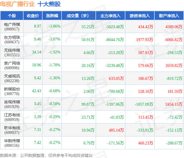 个股表现方面,电视广播行业当日领跌股为电广传媒(000917),该股当日报收8.97,下跌3.86%,成交量55.25万,主力资金净流出5023.48万元。东方明珠(600637)以下跌3.07%紧随其后,该股当日成交量50.91万,主力资金净流出8044.76万元。除此之外,无线传媒(301551)、贵广网络(600996)、天威视讯(002238)均进入当日熊股之列。具体个股列表见下表: