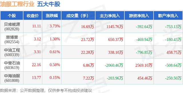 个股表现方面,油服工程行业当日领涨股为贝肯能源(002828),该股当日报收11.11,上涨3.73%,成交量16.69万,主力资金净流入1145.76万元。惠博普(002554)以上涨1.3%紧随其后,该股当日成交量23.72万,主力资金净流入650.37万元。除此之外,中油工程(600339)、中曼石油(603619)、中海油服(601808)均进入当日牛股之列。具体个股列表见下表: