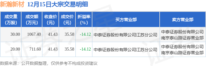 证券之星消息,12月15日新瀚新材发生大宗交易,交易数据如下: