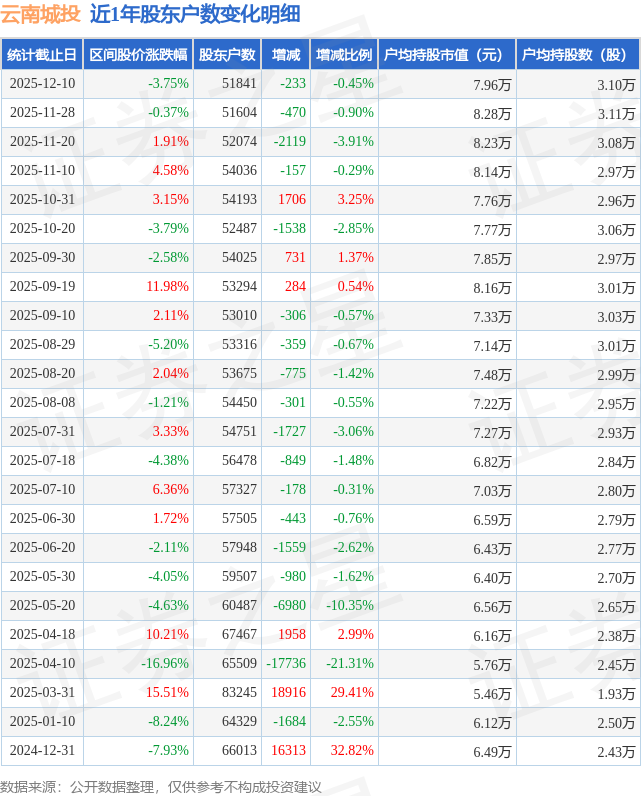 证券之星消息,近日云南城投披露,截至2025年12月10日公司股东户数为5.18万户,较11月20日减少233.0户,减幅为0.45%。户均持股数量由上期的3.11万股减少至3.1万股,户均持股市值为7.96万元。