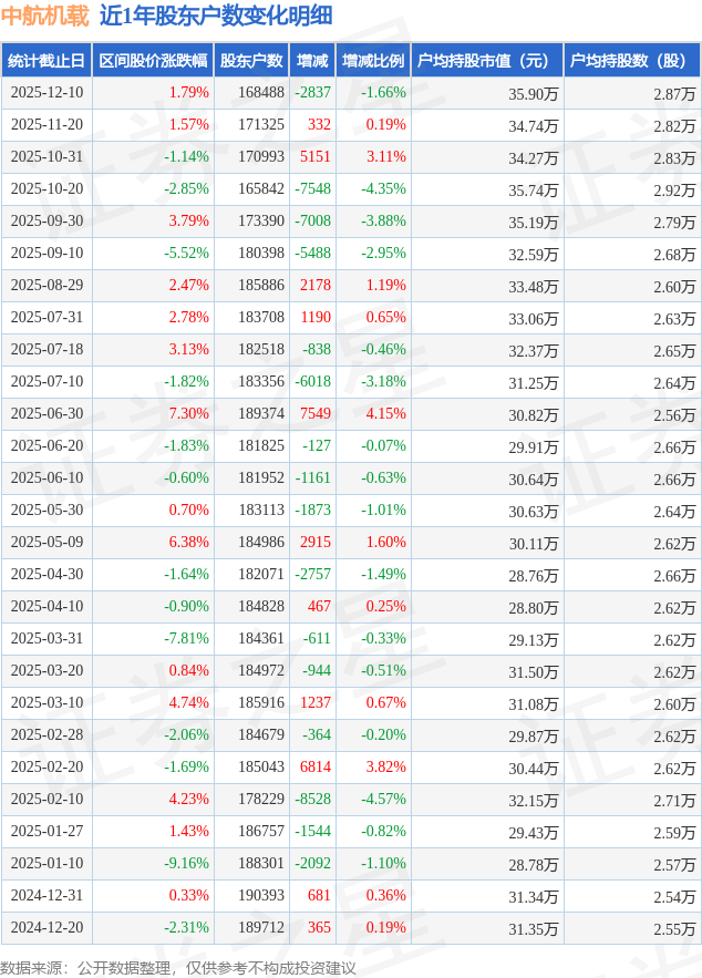 证券之星消息,近日中航机载披露,截至2025年12月10日公司股东户数为16.85万户,较11月20日减少2837.0户,减幅为1.66%。户均持股数量由上期的2.82万股增加至2.87万股,户均持股市值为35.9万元。