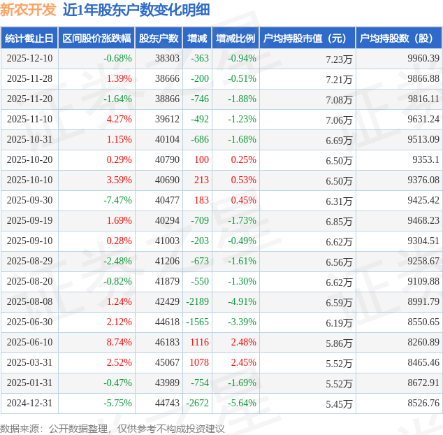 从股价来看,2025年11月28日至2025年12月10日,新农开发区间跌幅为0.68%,在此期间股东户数减少363.0户,减幅为0.94%。