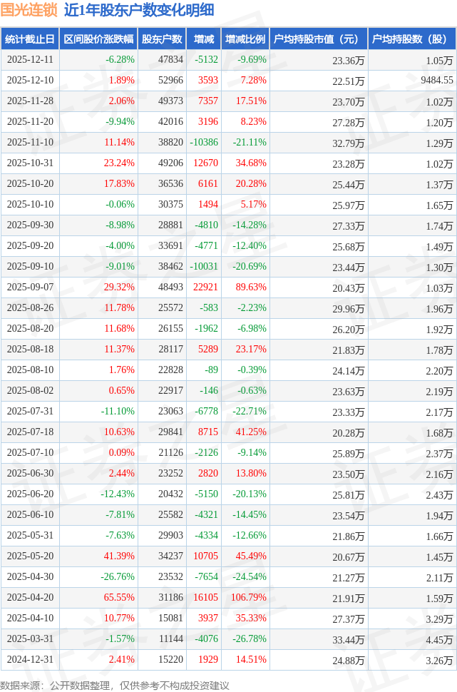 从股价来看,2025年12月10日至2025年12月11日,国光连锁区间跌幅为6.28%,在此期间股东户数减少5132.0户,减幅为9.69%。