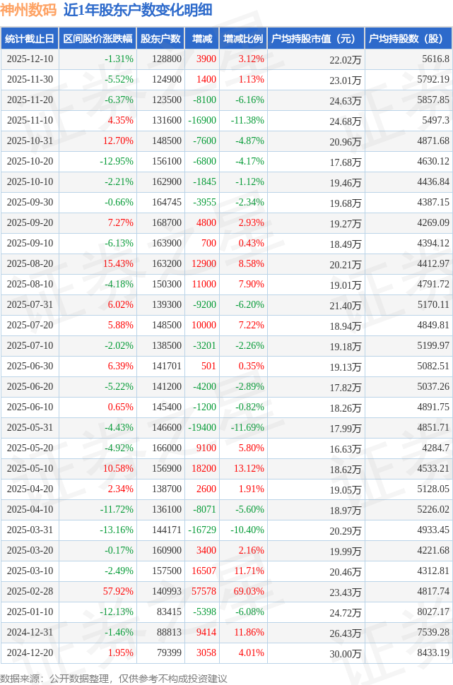 从股价来看,2025年11月30日至2025年12月10日,神州数码区间跌幅为1.31%,在此期间股东户数增加3900.0户,增幅为3.12%。