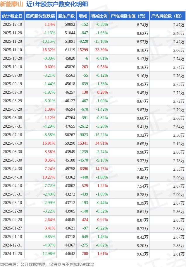 从股价来看,2025年11月28日至2025年12月10日,新能泰山区间涨幅为1.14%,在此期间股东户数减少152.0户,减幅为0.3%。