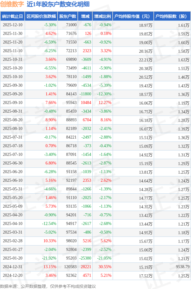 从股价来看,2025年11月30日至2025年12月10日,创维数字区间跌幅为5.3%,在此期间股东户数减少676.0户,减幅为0.94%。