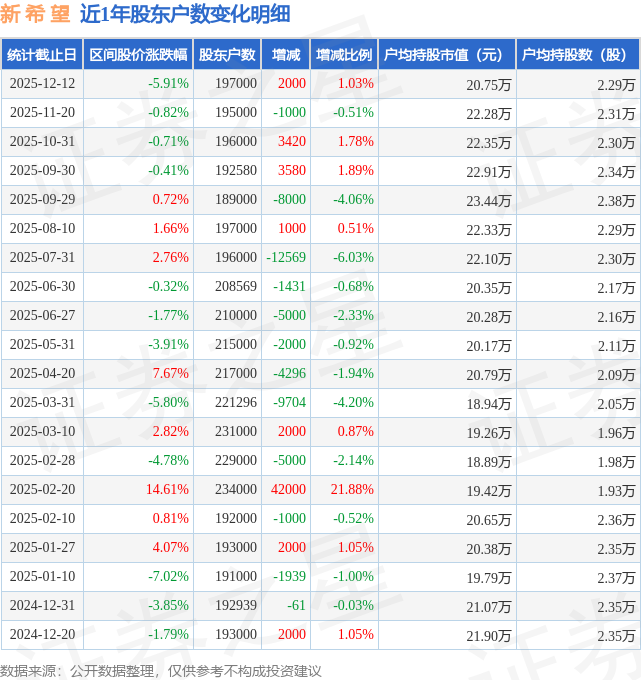 从股价来看,2025年11月20日至2025年12月12日,新 希 望区间跌幅为5.91%,在此期间股东户数增加2000.0户,增幅为1.03%。