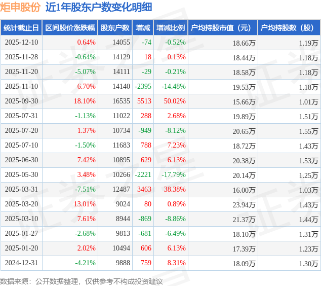 从股价来看,2025年11月28日至2025年12月10日,炬申股份区间涨幅为0.64%,在此期间股东户数减少74.0户,减幅为0.52%。
