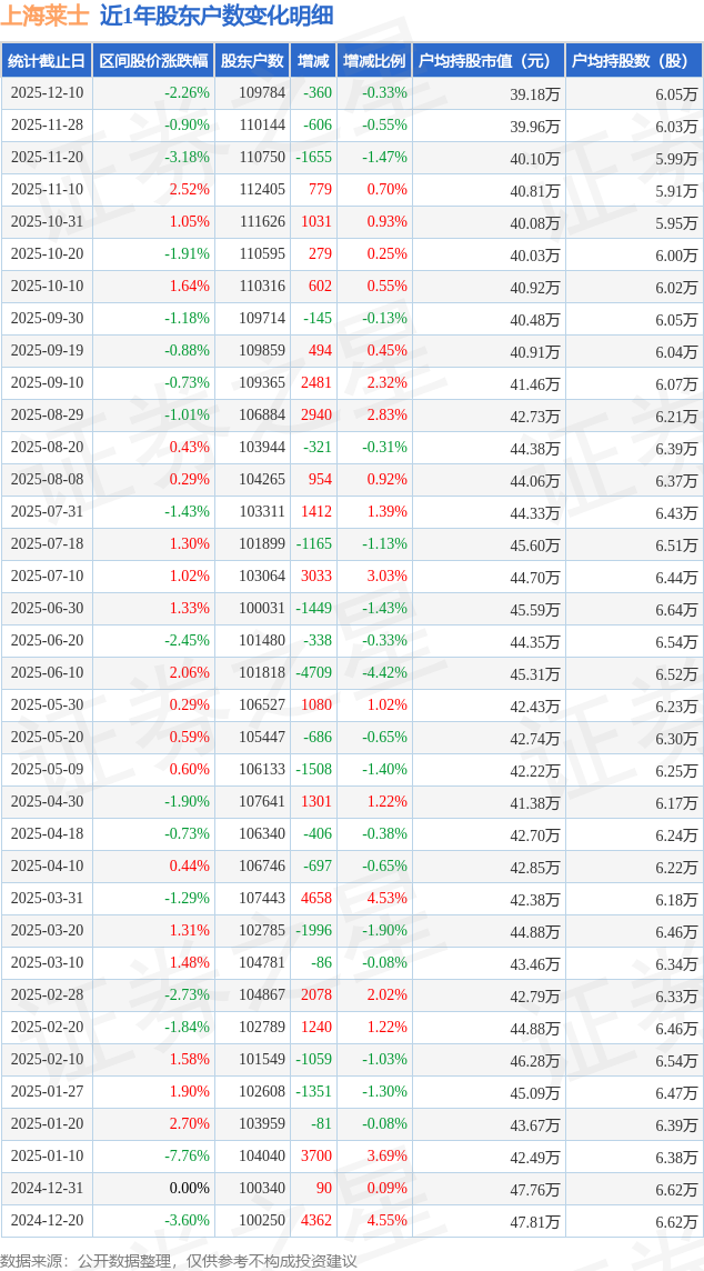 证券之星消息,近日上海莱士披露,截至2025年12月10日公司股东户数为10.98万户,较11月28日减少360.0户,减幅为0.33%。户均持股数量由上期的6.03万股增加至6.05万股,户均持股市值为39.18万元。