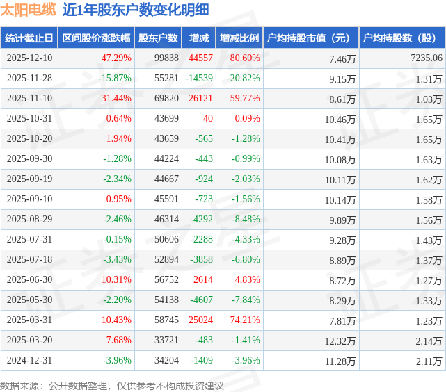 从股价来看,2025年11月28日至2025年12月10日,太阳电缆区间涨幅为47.29%,在此期间股东户数增加4.46万户,增幅为80.6%。