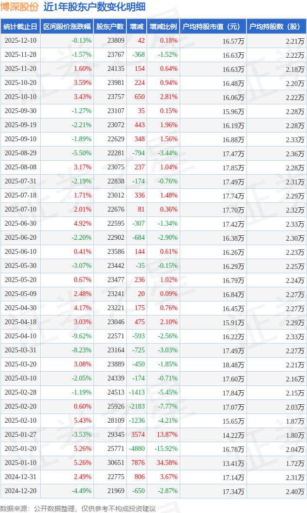 从股价来看,2025年11月28日至2025年12月10日,博深股份区间跌幅为0.13%,在此期间股东户数增加42.0户,增幅为0.18%。