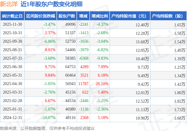 从股价来看,2025年10月31日至2025年11月30日,新北洋区间跌幅为3.47%,在此期间股东户数减少2241.0户,减幅为4.37%。