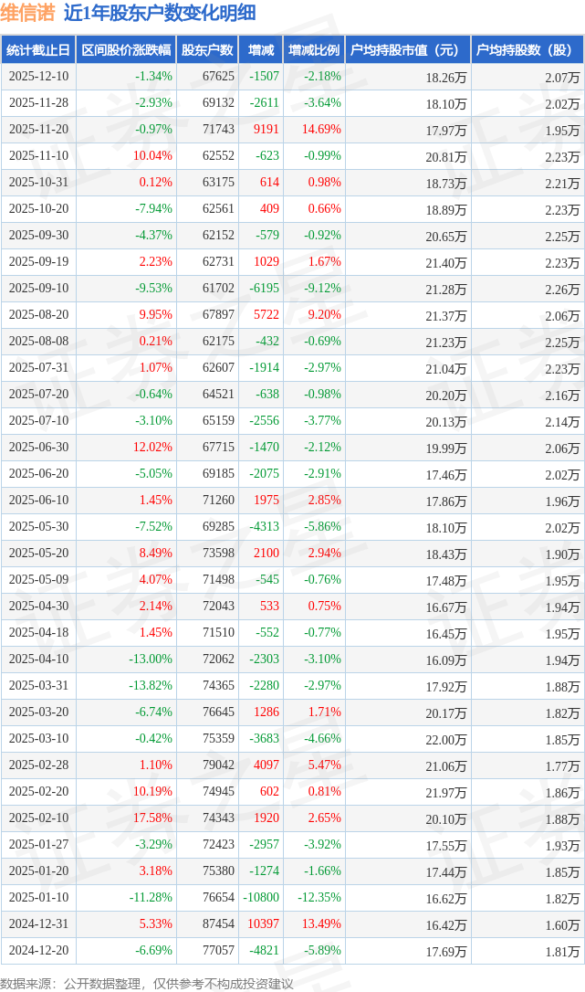 从股价来看,2025年11月28日至2025年12月10日,维信诺区间跌幅为1.34%,在此期间股东户数减少1507.0户,减幅为2.18%。