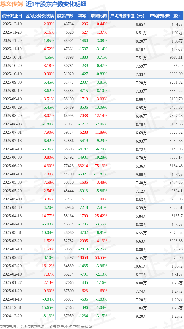 从股价来看,2025年11月28日至2025年12月10日,慈文传媒区间涨幅为2.03%,在此期间股东户数增加206.0户,增幅为0.44%。