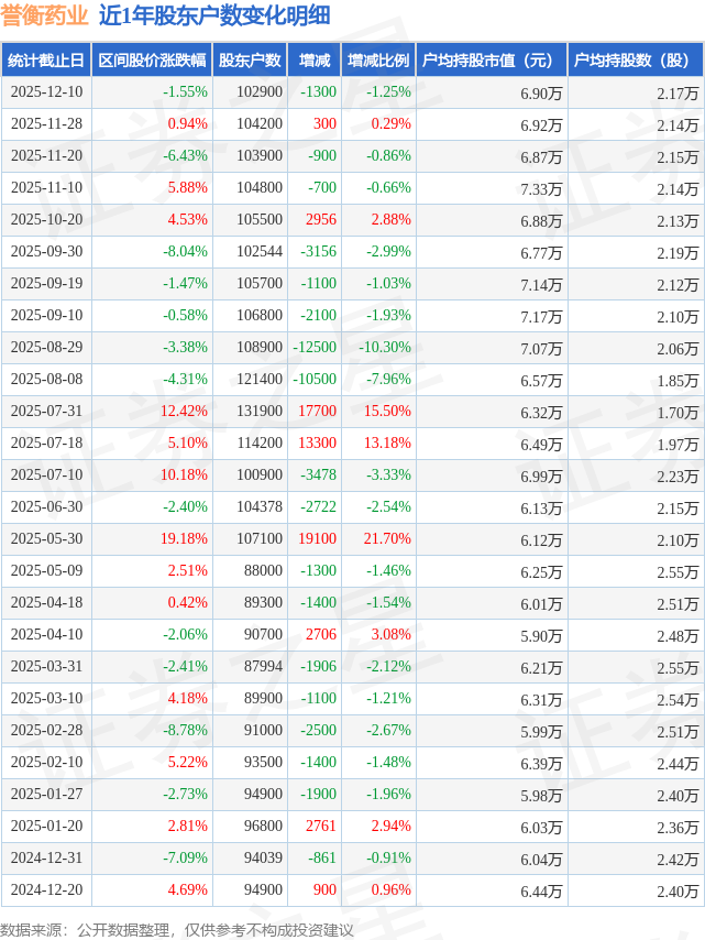 从股价来看,2025年11月28日至2025年12月10日,誉衡药业区间跌幅为1.55%,在此期间股东户数减少1300.0户,减幅为1.25%。
