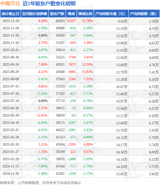 从股价来看,2025年11月28日至2025年12月10日,中南文化区间涨幅为8.2%,在此期间股东户数增加1.64万户,增幅为32.78%。