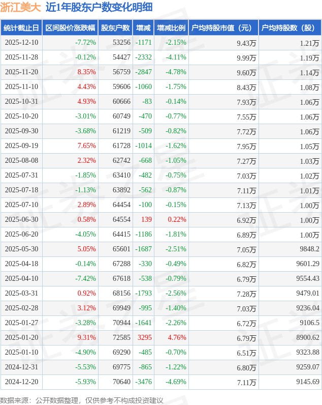 从股价来看,2025年11月28日至2025年12月10日,浙江美大区间跌幅为7.72%,在此期间股东户数减少1171.0户,减幅为2.15%。