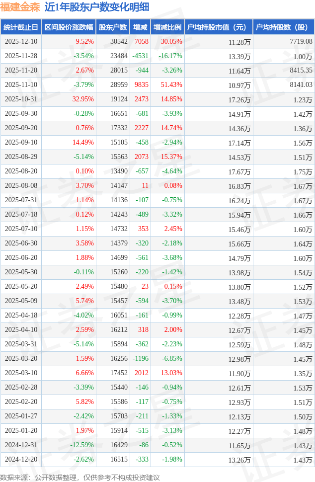 从股价来看,2025年11月28日至2025年12月10日,福建金森区间涨幅为9.52%,在此期间股东户数增加7058.0户,增幅为30.05%。