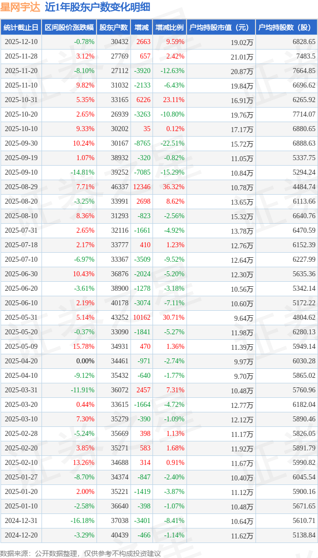 从股价来看,2025年11月30日至2025年12月10日,星网宇达区间跌幅为0.78%,在此期间股东户数增加2663.0户,增幅为9.59%。