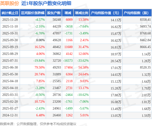 从股价来看,2025年11月10日至2025年11月28日,英联股份区间跌幅为4.57%,在此期间股东户数增加6009.0户,增幅为13.58%。