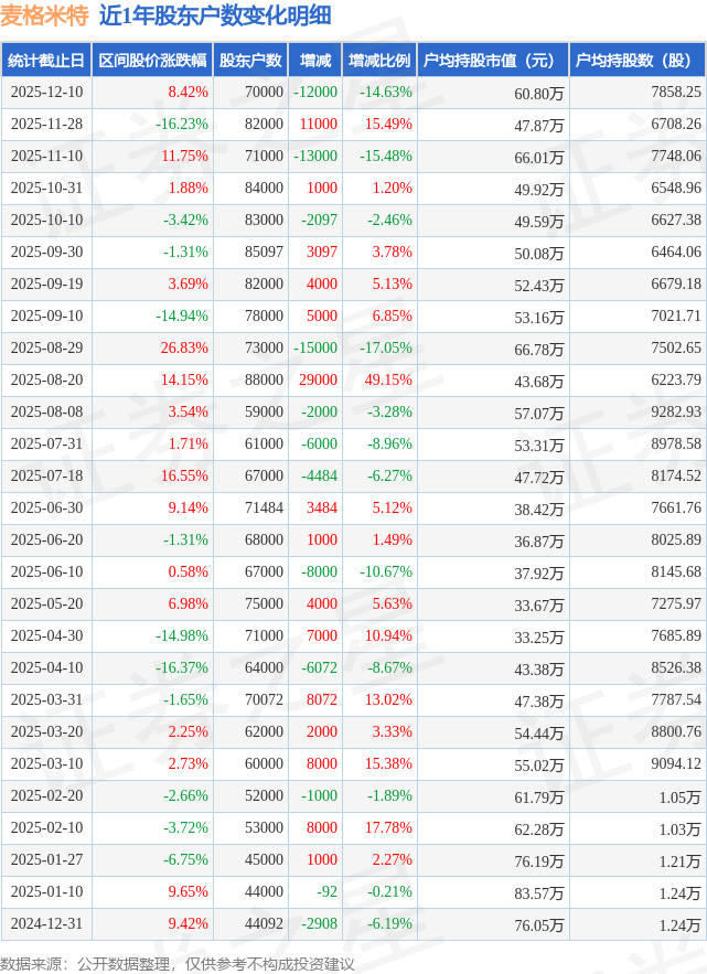 从股价来看,2025年11月28日至2025年12月10日,麦格米特区间涨幅为8.42%,在此期间股东户数减少1.2万户,减幅为14.63%。