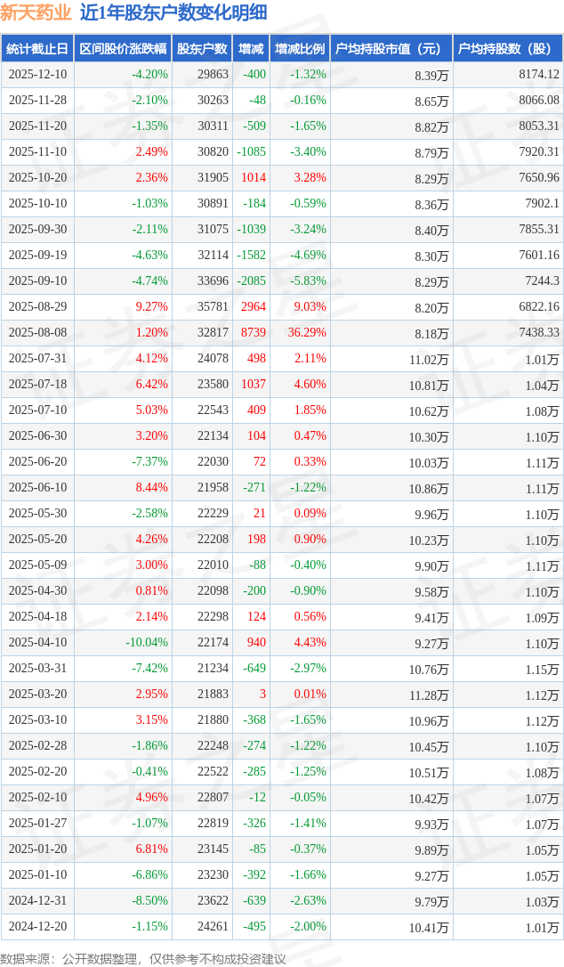 从股价来看,2025年11月28日至2025年12月10日,新天药业区间跌幅为4.2%,在此期间股东户数减少400.0户,减幅为1.32%。
