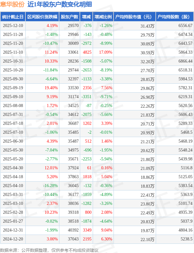 从股价来看,2025年11月28日至2025年12月10日,意华股份区间涨幅为4.19%,在此期间股东户数减少376.0户,减幅为1.26%。