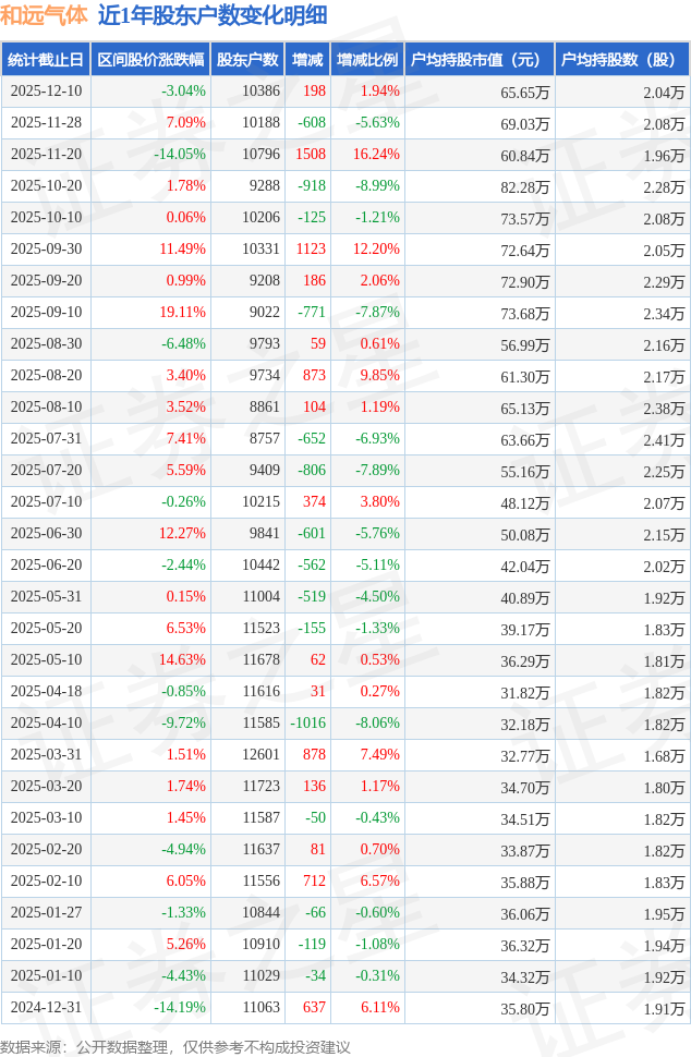 从股价来看,2025年11月28日至2025年12月10日,和远气体区间跌幅为3.04%,在此期间股东户数增加198.0户,增幅为1.94%。