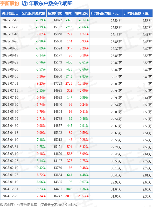 从股价来看,2025年11月30日至2025年12月10日,宇新股份区间跌幅为2.29%,在此期间股东户数减少325.0户,减幅为2.14%。