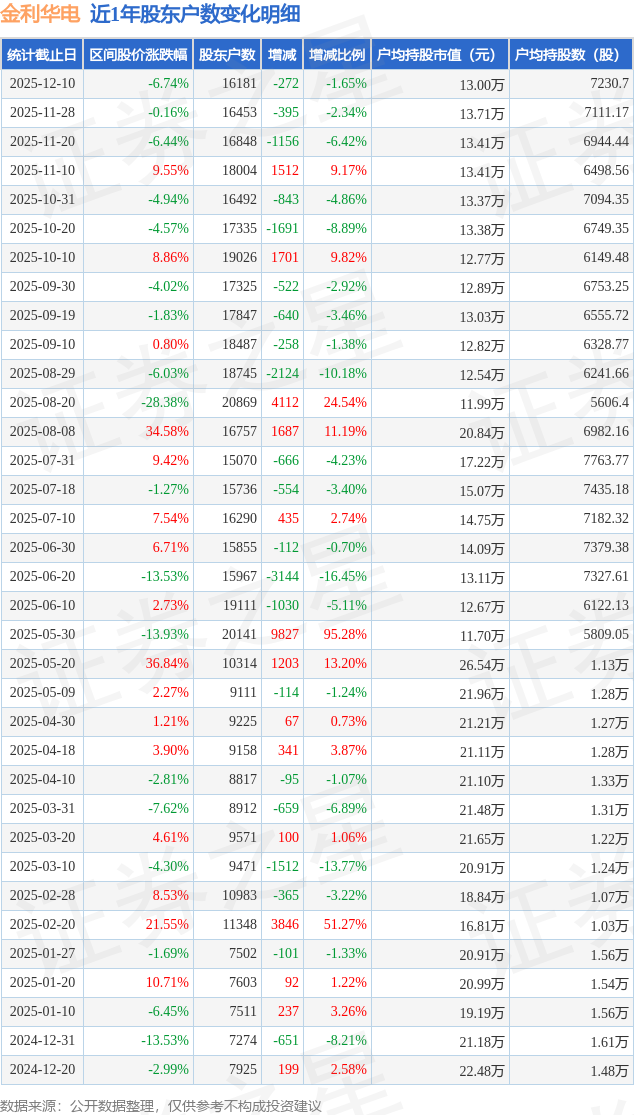 从股价来看,2025年11月28日至2025年12月10日,金利华电区间跌幅为6.74%,在此期间股东户数减少272.0户,减幅为1.65%。
