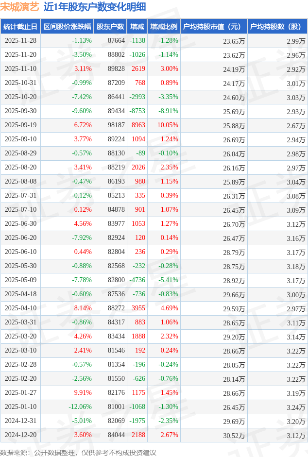 从股价来看,2025年11月20日至2025年11月28日,宋城演艺区间跌幅为1.13%,在此期间股东户数减少1138.0户,减幅为1.28%。