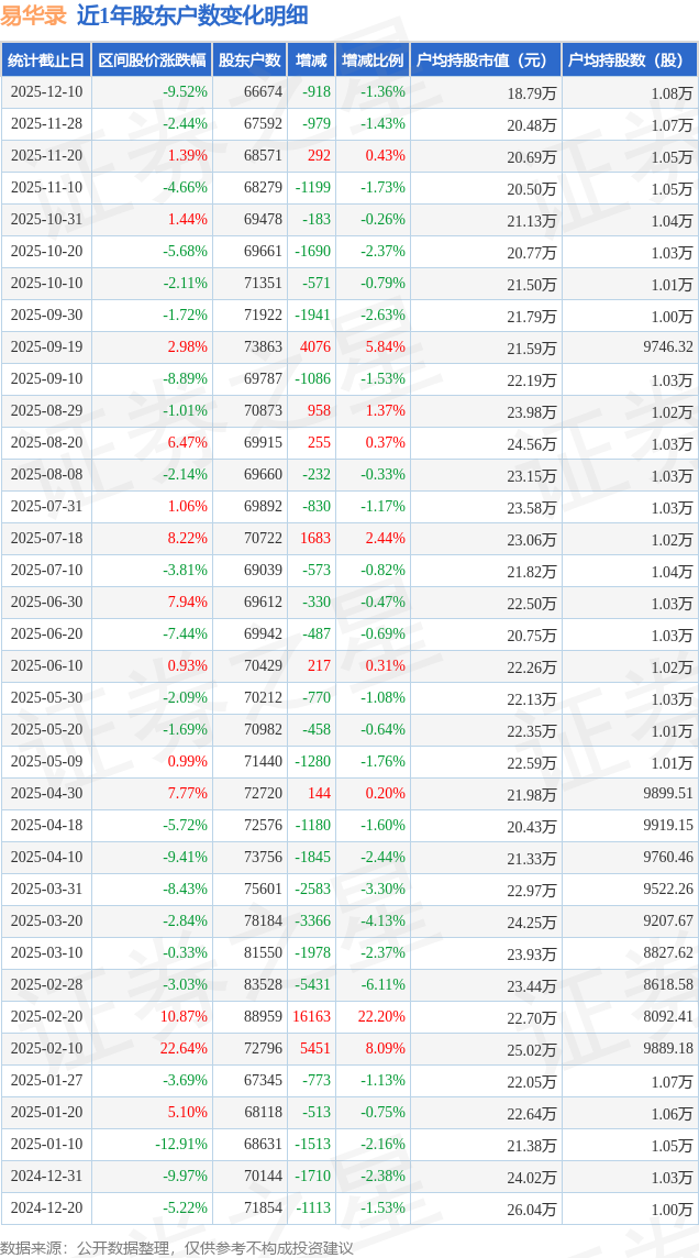 证券之星消息,近日易华录披露,截至2025年12月10日公司股东户数为6.67万户,较11月28日减少918.0户,减幅为1.36%。户均持股数量由上期的1.07万股增加至1.08万股,户均持股市值为18.79万元。