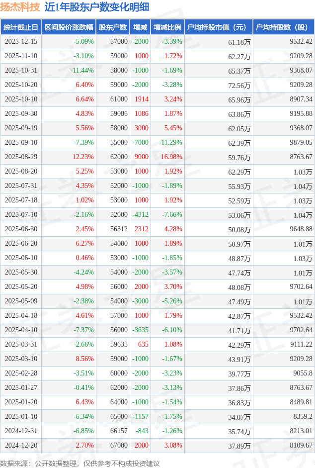 从股价来看,2025年11月10日至2025年12月15日,扬杰科技区间跌幅为5.09%,在此期间股东户数减少2000.0户,减幅为3.39%。