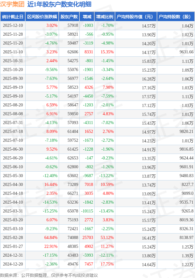 从股价来看,2025年11月28日至2025年12月10日,汉宇集团区间涨幅为3.02%,在此期间股东户数减少1003.0户,减幅为1.7%。