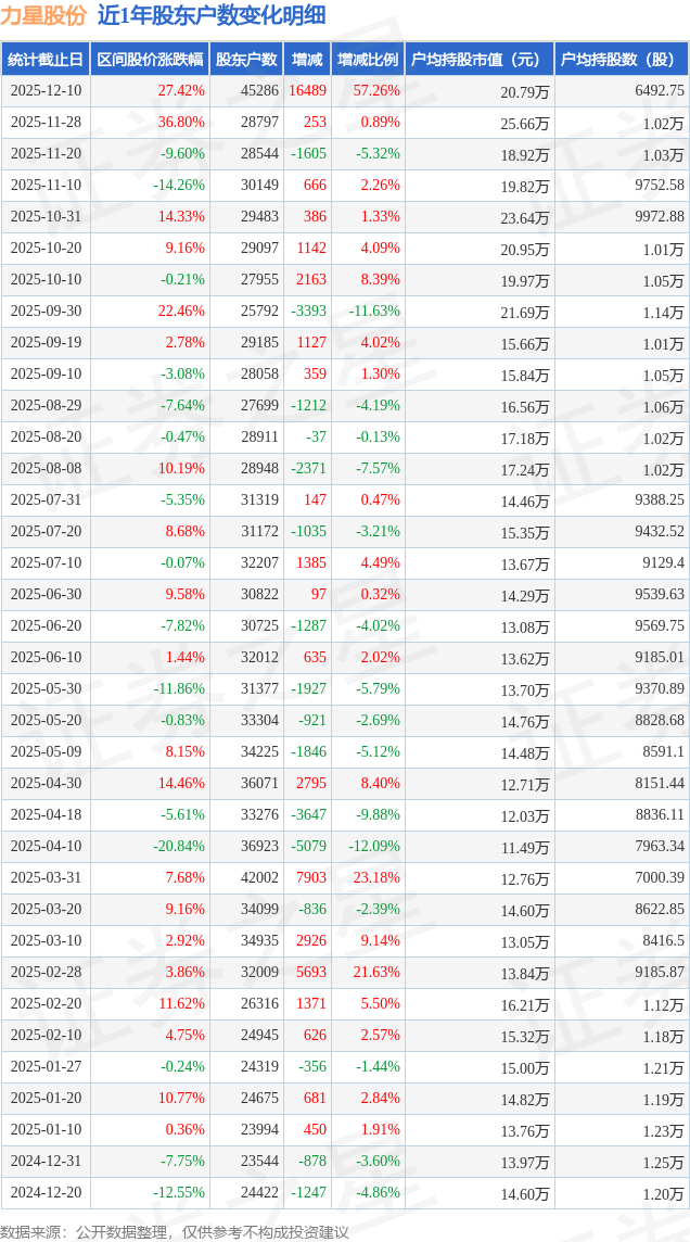 从股价来看,2025年11月28日至2025年12月10日,力星股份区间涨幅为27.42%,在此期间股东户数增加1.65万户,增幅为57.26%。