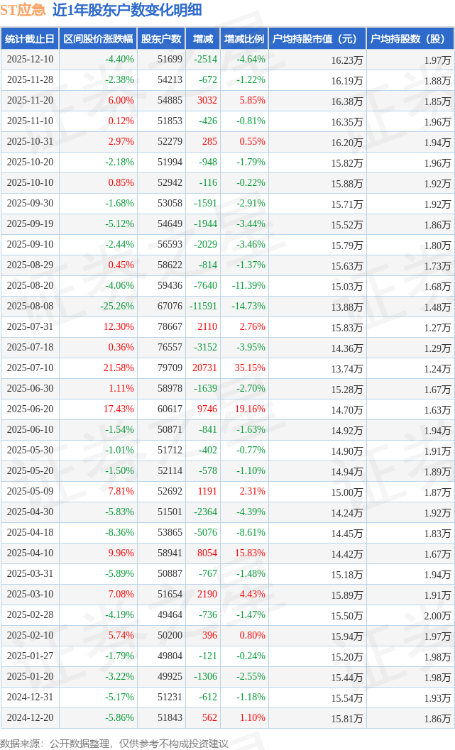 从股价来看,2025年11月28日至2025年12月10日,ST应急区间跌幅为4.4%,在此期间股东户数减少2514.0户,减幅为4.64%。