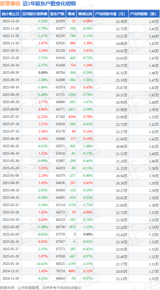 从股价来看,2025年11月28日至2025年12月10日,欧普康视区间跌幅为1.53%,在此期间股东户数增加52.0户,增幅为0.08%。