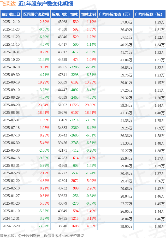 证券之星消息,近日飞荣达披露,截至2025年12月10日公司股东户数为4.51万户,较11月28日增加530.0户,增幅为1.19%。户均持股数量由上期的1.31万股减少至1.29万股,户均持股市值为37.03万元。