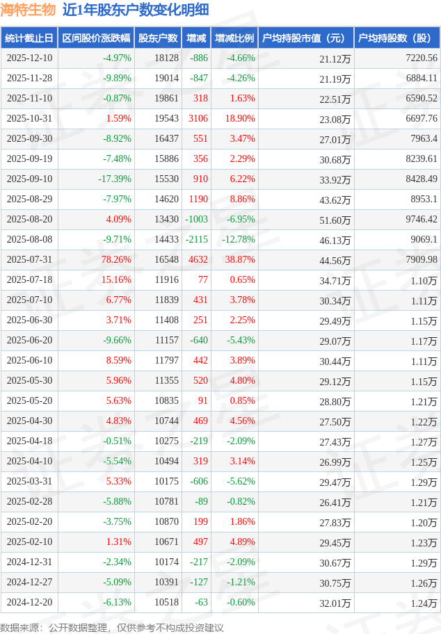 从股价来看,2025年11月28日至2025年12月10日,海特生物区间跌幅为4.97%,在此期间股东户数减少886.0户,减幅为4.66%。