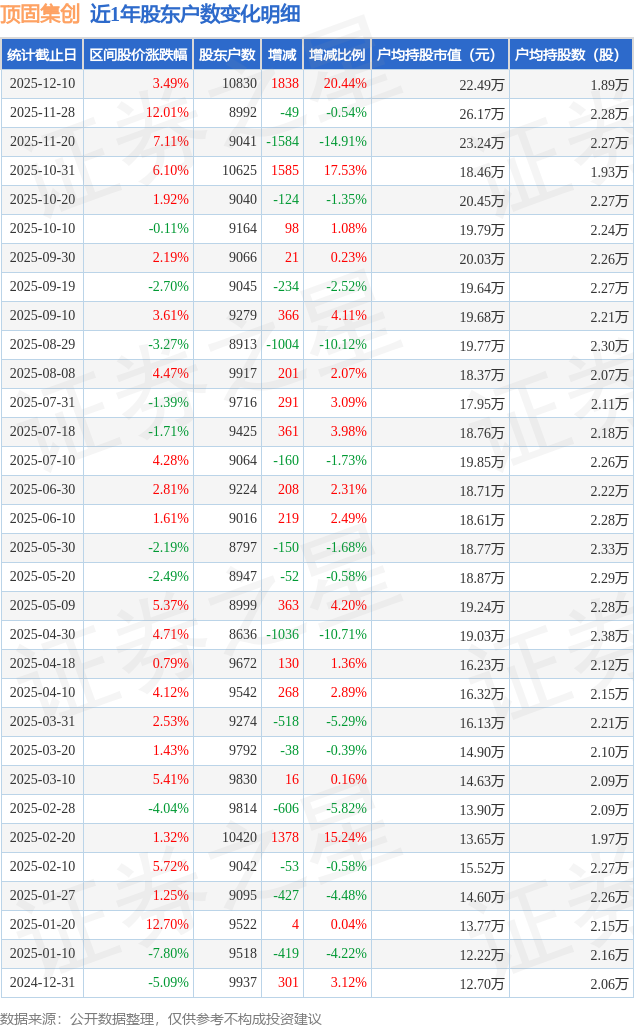 从股价来看,2025年11月28日至2025年12月10日,顶固集创区间涨幅为3.49%,在此期间股东户数增加1838.0户,增幅为20.44%。