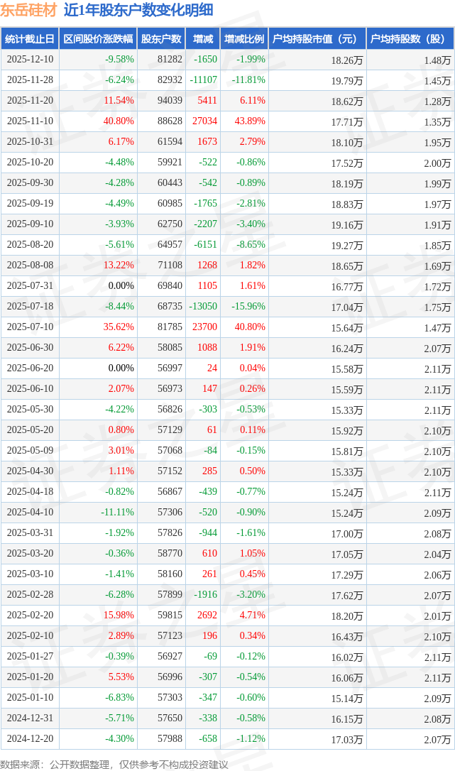 从股价来看,2025年11月28日至2025年12月10日,东岳硅材区间跌幅为9.58%,在此期间股东户数减少1650.0户,减幅为1.99%。