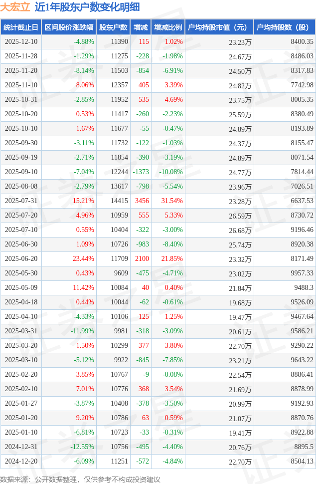 从股价来看,2025年11月28日至2025年12月10日,大宏立区间跌幅为4.88%,在此期间股东户数增加115.0户,增幅为1.02%。
