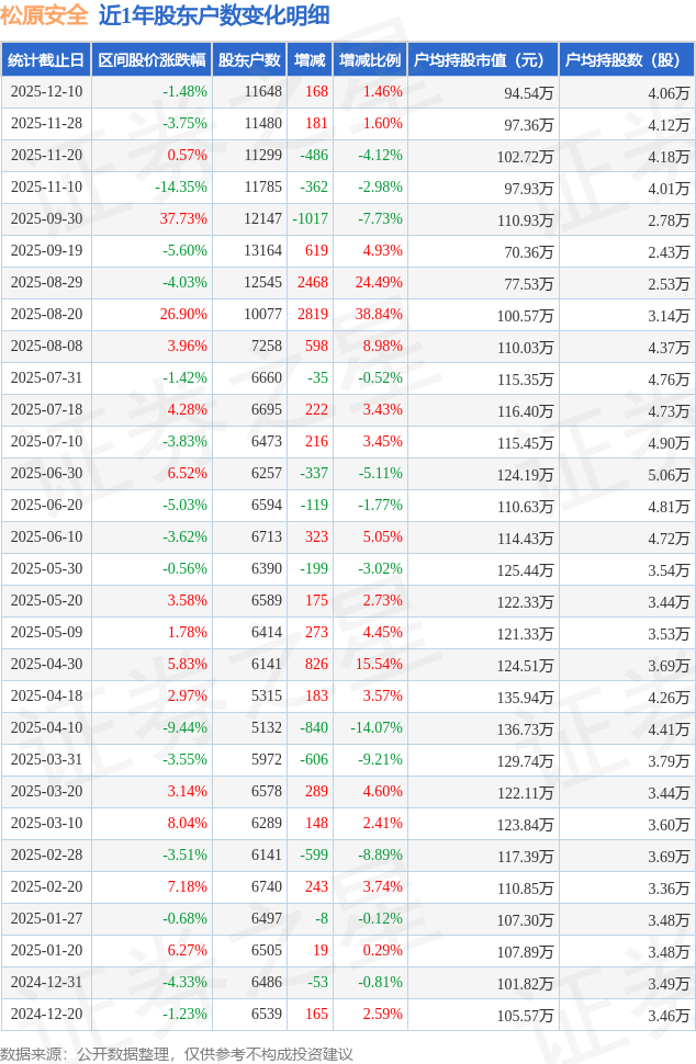 从股价来看,2025年11月28日至2025年12月10日,松原安全区间跌幅为1.48%,在此期间股东户数增加168.0户,增幅为1.46%。