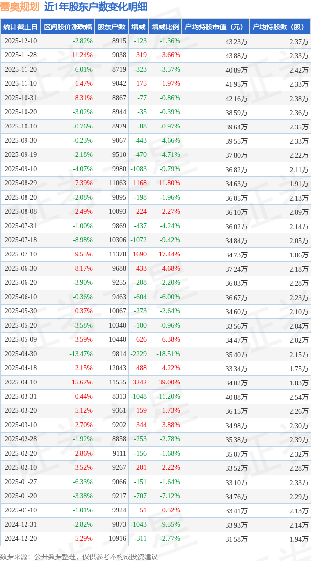 从股价来看,2025年11月28日至2025年12月10日,蕾奥规划区间跌幅为2.82%,在此期间股东户数减少123.0户,减幅为1.36%。