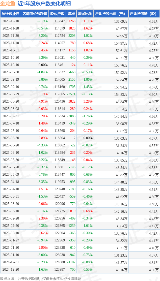 从股价来看,2025年11月28日至2025年12月10日,金龙鱼区间跌幅为2.19%,在此期间股东户数增加1268.0户,增幅为1.11%。
