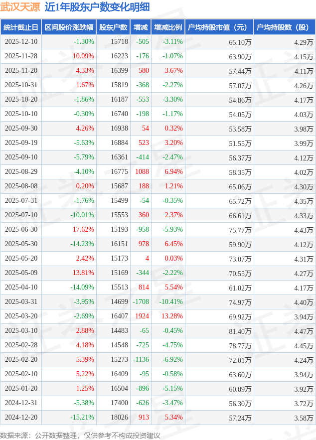 从股价来看,2025年11月28日至2025年12月10日,武汉天源区间跌幅为1.3%,在此期间股东户数减少505.0户,减幅为3.11%。