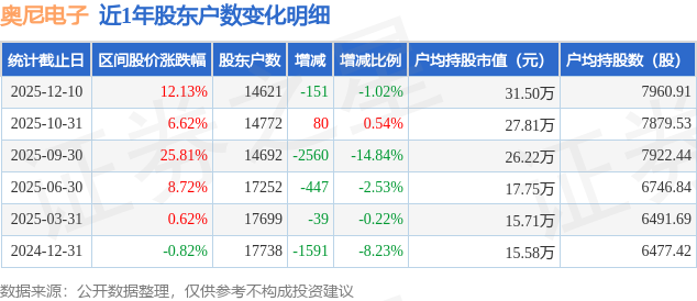 从股价来看,2025年10月31日至2025年12月10日,奥尼电子区间涨幅为12.13%,在此期间股东户数减少151.0户,减幅为1.02%。